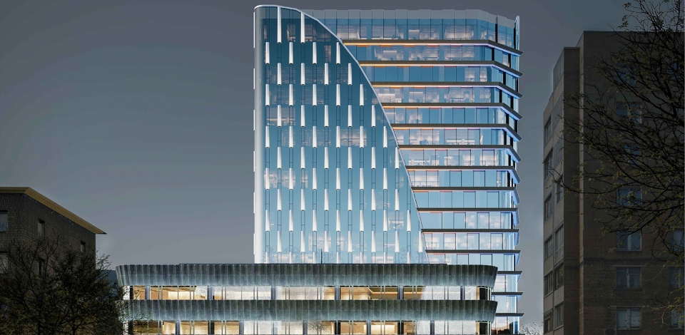 Корпуса нового многофункционального комплекса выполнят в едином стиле с применением фасадного остекления, панелей из фиброцемента и стеклокомпозита.