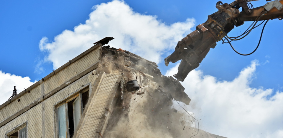 Полностью расселенные здания демонтируют по технологии «умный снос» — поэтапно разбирают на отдельные элементы. Отходы сортируются по группам и отправляются на переработку для повторного использования.