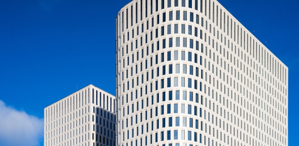 Архитекторами проекта выступили «Цимайло Ляшенко и Партнеры». Фасады делового комплекса выполнены из алюминиевых ламелей в светлых оттенках, обладают увеличенным коэффициентом светопрозрачности и обеспечивают проницаемость офисных башен. Сетка фасада дополнительно подчеркивает пластику объекта, а белые панели придают высотным корпусам воздушность, выделяя их на фоне панорамы города.