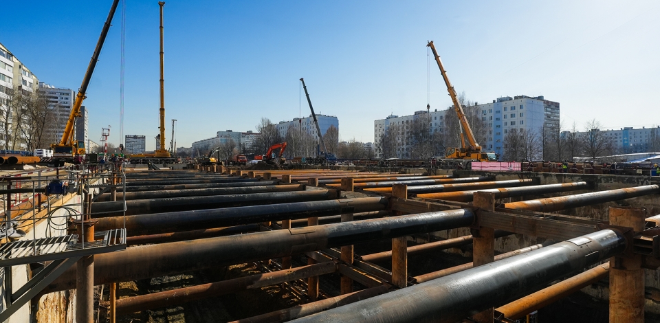 Наполовину завершено устройство ограждающих конструкций котлована для будущей станции метро «Гольяново»