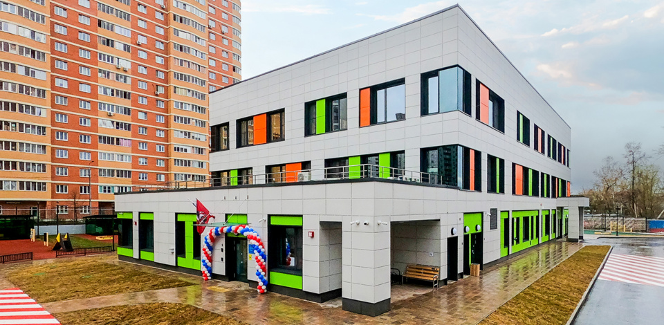 Как уточняется на портале mos.ru, трехэтажный детский сад площадью более 3 тыс. кв. метров возвели по индивидуальному проекту. Вентилируемый фасад выполнили из керамогранита, его оформили в светло-зеленых, оранжевых и белых цветах. Светлый красочный интерьер формирует дружелюбную и приятную атмосферу.