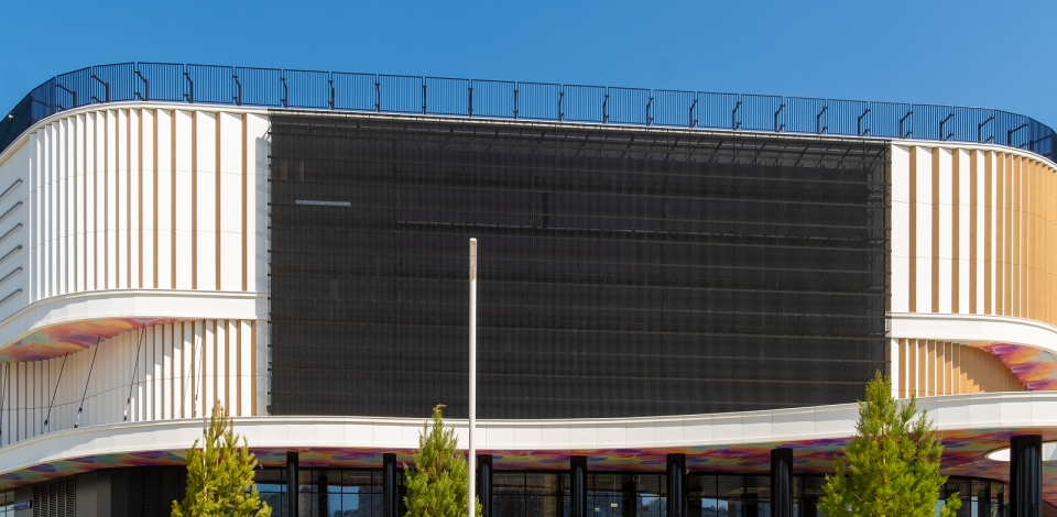 При отделке фасада ТРЦ использованы металлокассетные панели, витражное остекление. Все три входа, включая главный, выполнены на уровне земли, чтобы доступ в здание был удобен всем посетителям, в том числе маломобильным.