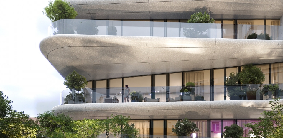 первый — со стеклянными полуколоннами; второй — из натурального камня с развивающейся кверху волнообразной пластикой балконов; третий — белый глянцевый с уникальными для центра Москвы консольными террасами.«В оформлении трехчастного фасада используют крупноформатные плиты из натурального камня и декоративные элементы из стекла. Изящные динамичные вылеты террас будут выступать на четыре метра вперед», — пояснил архитектор, сооснователь бюро ADM architects Андрей Романов.