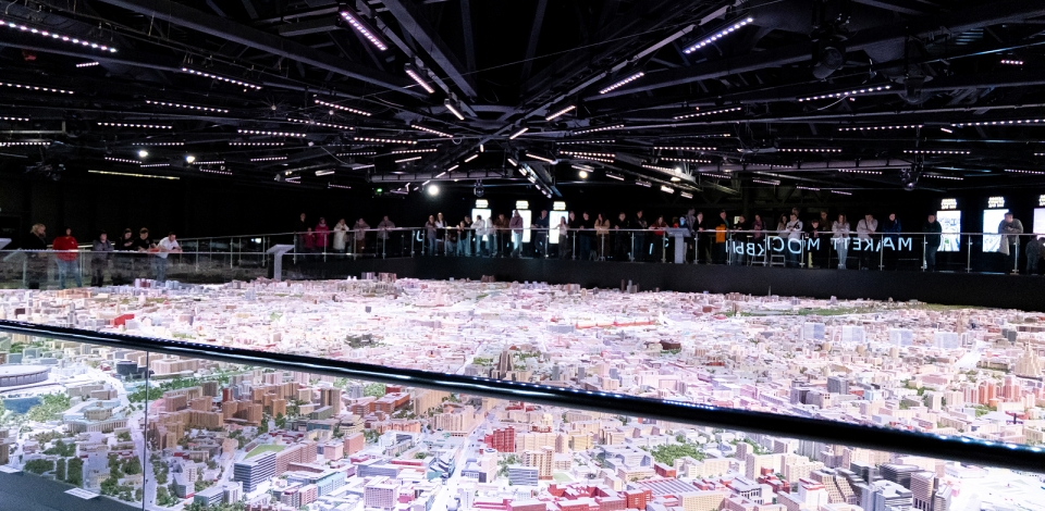 Особенность макета — в его интерактивности: гости могут управлять подсветкой отдельного здания, района, улицы или всего макета, менять освещение с дневного на ночное, подсветить радугу и облака.