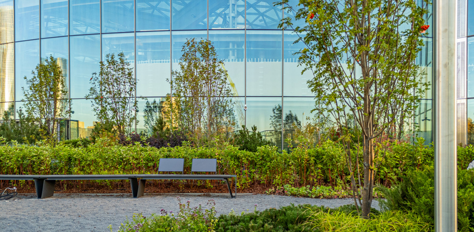 17.09.25 1/3Озеленение подобрано так, чтобы парк оставался живым и красивым даже в условиях ветров, относительно небольшого слоя почвы на кровле стилобата и отраженного от стекол двух офисных башен солнечного света.