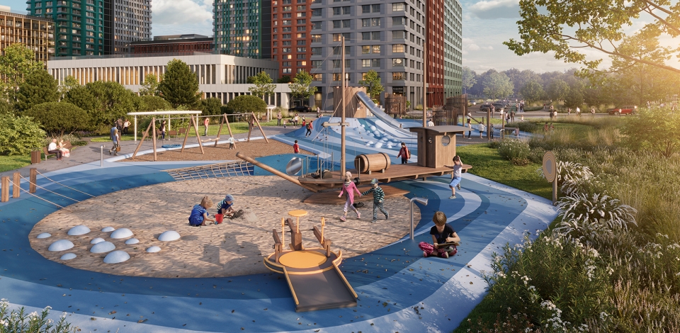 В ходе благоустройства детских площадок для малышей девелопер разместит песочницы, безопасные качели, горки и тактильные стены.