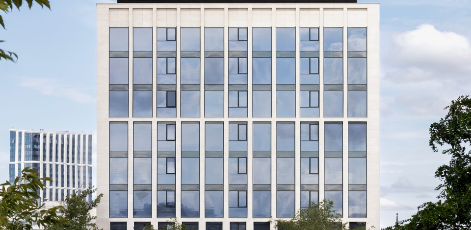 Фасады бизнес-центра отделаны натуральным камнем светлого оттенка, по всему периметру выполнено панорамное остекление, площадь которого увеличивается на верхних этажах.