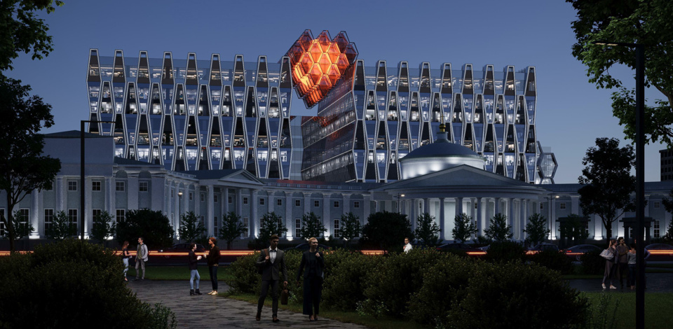 Согласно проекту, главный фасад обращен к парку и на историческое здание НИИ скорой помощи. Из-за разницы высот корпусов и различий в пропорциях «молекулярная решетка» со стороны Грохольского пер. будет напоминать соты, а с Садового кольца — фальконье — стеклянный кирпич, который был излюбленным материалом эпохи модерна и символом русской эстетики рубежа XIX-XX веков.