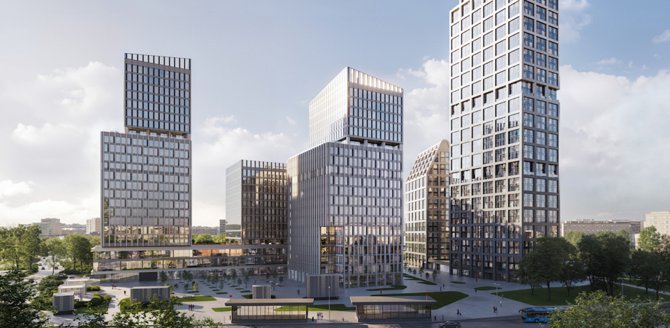 Особенностью проекта офисного квартала станут устремленные вверх объемы последних этажей. При этом 13-этажный корпус по проекту самый строгий из всех. Он вытянут вдоль стилобата и служит фоном для башен объекта и связывает все здания в архитектурный ансамбль. Эффектная высокая арка, выделяющая главный вход одного из зданий, придаст фасаду выразительность и гармонично интегрирует офисный квартал в городскую среду. На крыше стилобата, а также на верхних этажах башен появятся офисы с террасой. Корпуса офисного квартала будут выполнены в панорамном остеклении. Архитектурная концепция разработана бюро Kleinewelt Аrchitekten.