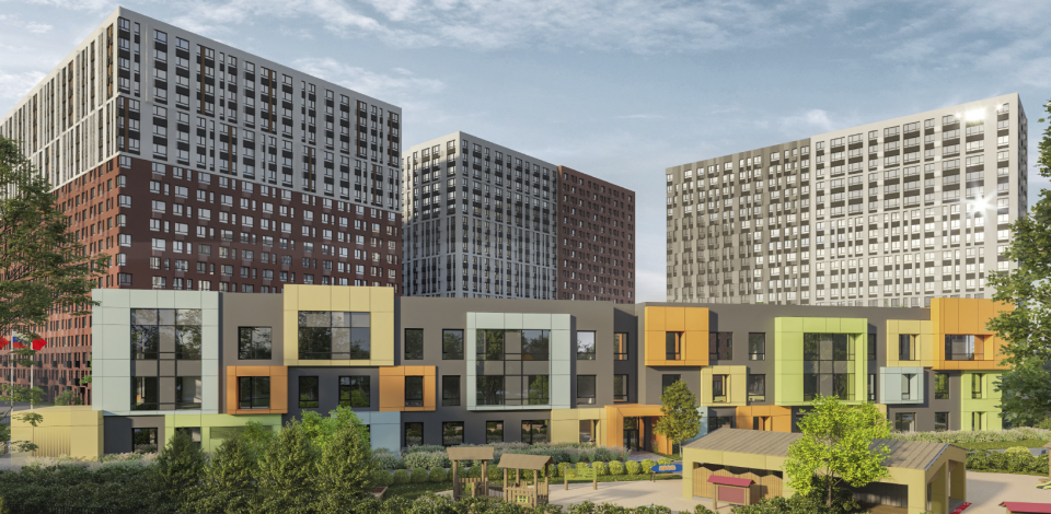 Индивидуальный архитектурный облик здания строится на объемных элементах в виде стилизованных детских кубиков различного размера, расположенных в зоне оконных проемов. Для их создания используют металлокассеты желтого, салатового, голубого и оранжевого цветов. Тот же прием используют для оформления козырьков входных групп. Штукатурка графитового оттенка, которую используют для оформления стен, позволит сбалансировать яркие краски и послужит фоном для декора.