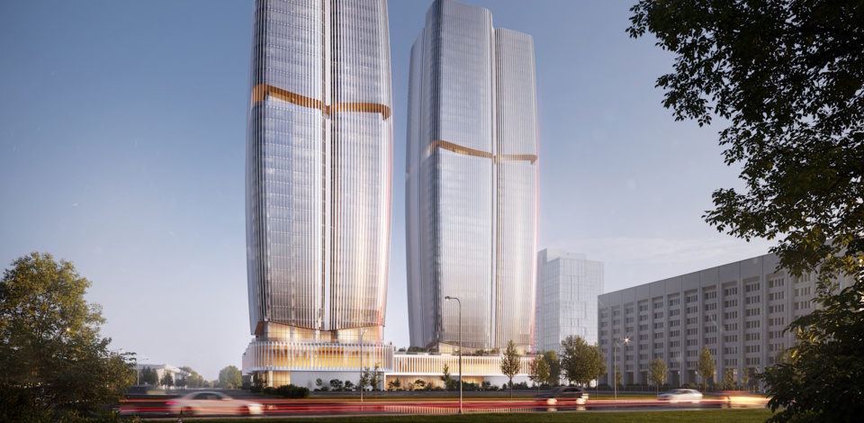 «Деловой центр составят две разновысотные башни, объединенные многоуровневым общественным стилобатом, что позволит сосредоточить деловую, сервисную и общественную активность в пределах одного городского узла. Криволинейный фасад стилобата сформирует выразительную линию, усилив связь интерьеров с городским пространством, и создаст комфортный масштаб для пешехода. Высотная часть комплекса насчитывает несколько десятков этажей, формируя заметный силуэт в панораме магистрали и усиливая деловой потенциал территории», — отметил Владислав Овчинский.