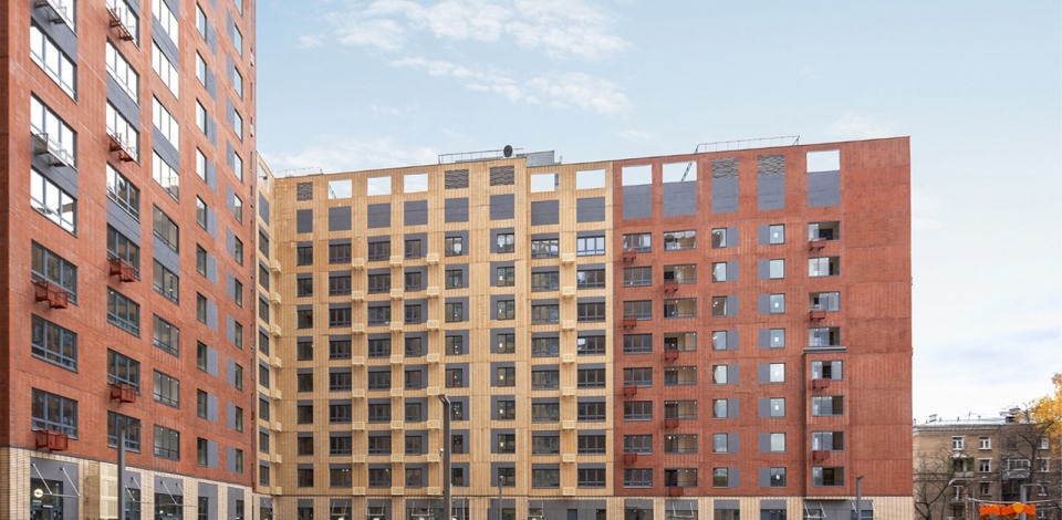При внешней отделке фасадов использованы трехслойные стеновые панели, облицованные плиткой с фактурой под кирпич, а также с текстурированным бетоном в песочном, терракотовом и графитовом оттенках.