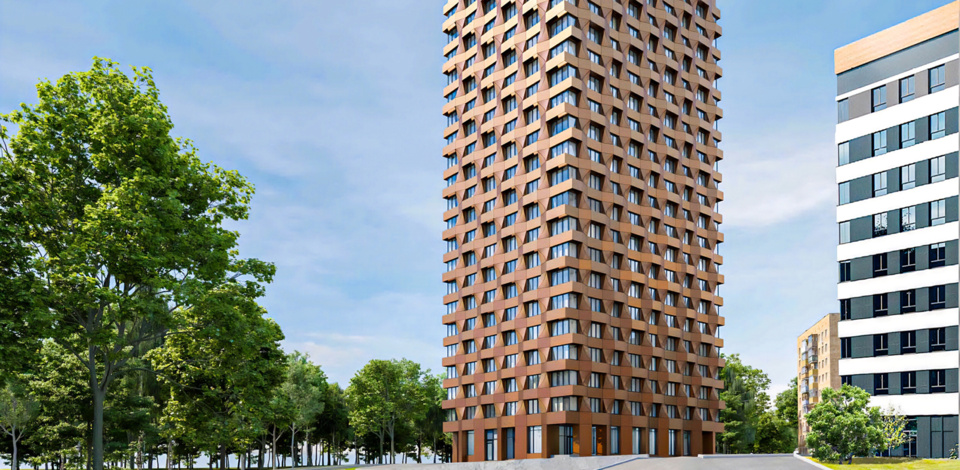 Фасад дома выполнен из установленных на разном выносе модулей оригинального медного оттенка, в которые интегрированы корзины для кондиционеров. Такое чередование объемных фигур создает эффект мозаики с плавным перетеканием форм.