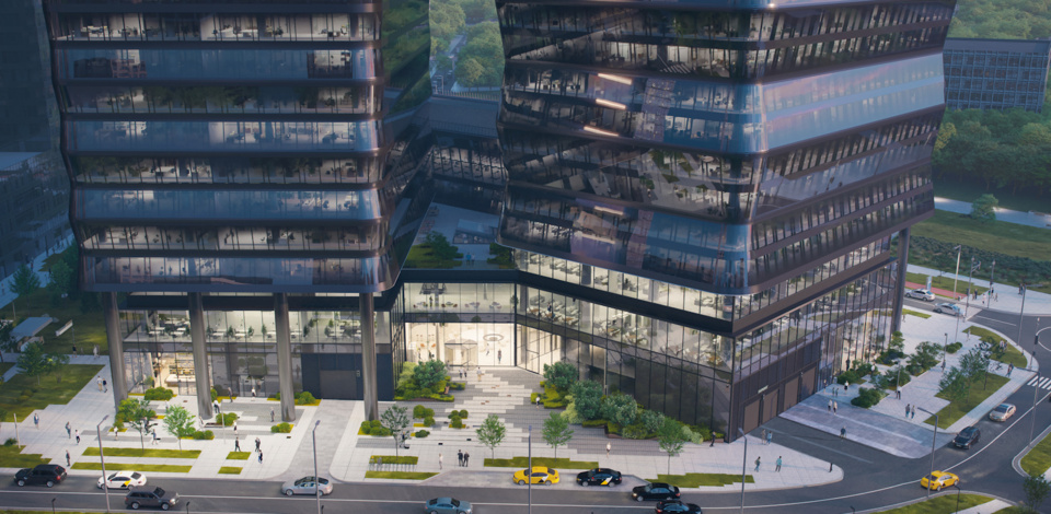 Скругленные грани, а также волнообразный рельеф башен добавит мягкости внешнему облику многофункционального комплекса. При облицовке используют витражное остекление, стемалит, ламели и навесные керамические панели. Наклонное тонированное остекление усилит визуальный эффект и создаст комфортную среду внутри, защищая от перегрева и обеспечивая приватность.